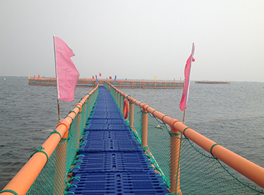 1、 网箱骨架及踏板采用HDPE材料。利用这种材料良好的柔性和刚性的结合,使渔排网箱整体更牢固、安全性更高,抗风浪性更好。